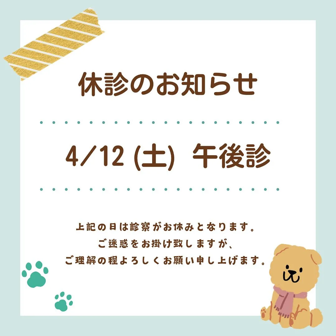 【休診日のお知らせ】 2025/04/09 【休診日のお知らせ】 こんにちは! 茨木市のゆうり動物病院です♪ 4/12(土)の午後診は休診とさせていただきます。 患者様にはご不便をおかけいたしますが、ご理解のほどよろしくお願いします。 #ゆうり動物病院 #動物病院 #駅近 #新規開院 #地域密着 #大阪府 #茨木市 #高槻市 #茨木市